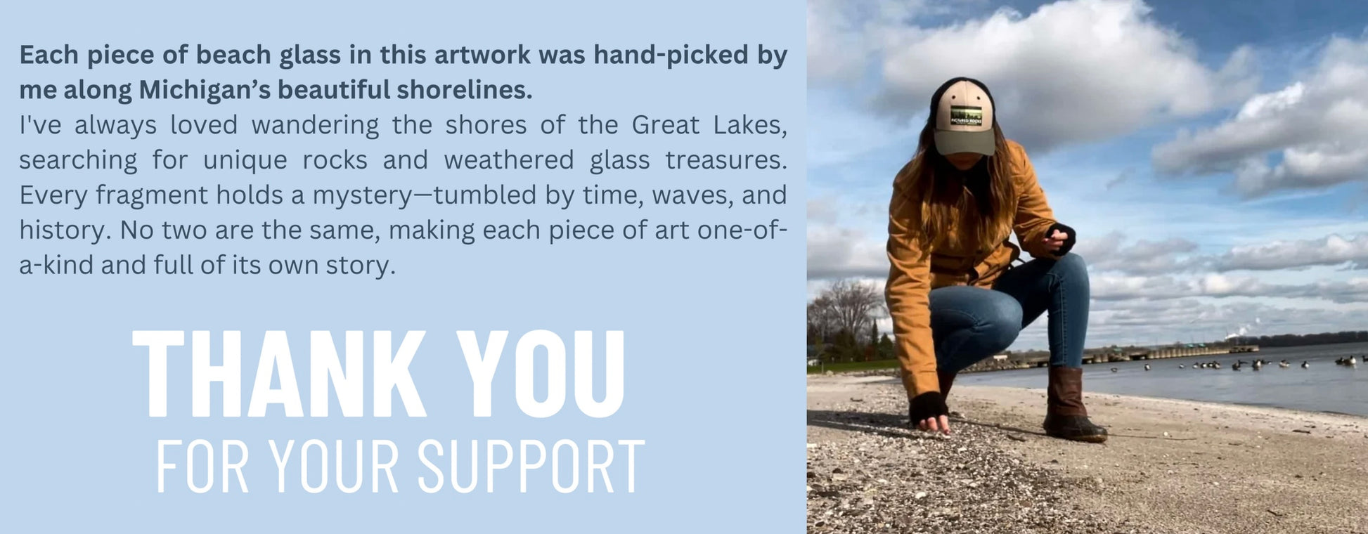 Bring a piece of Michigan’s shoreline into your home with this original hand-painted and hand-drawn artwork. Each piece is accented with genuine beach glass I personally collected along Michigan’s Great Lakes shores, making every artwork one-of-a-kind. Matted and ready to frame: