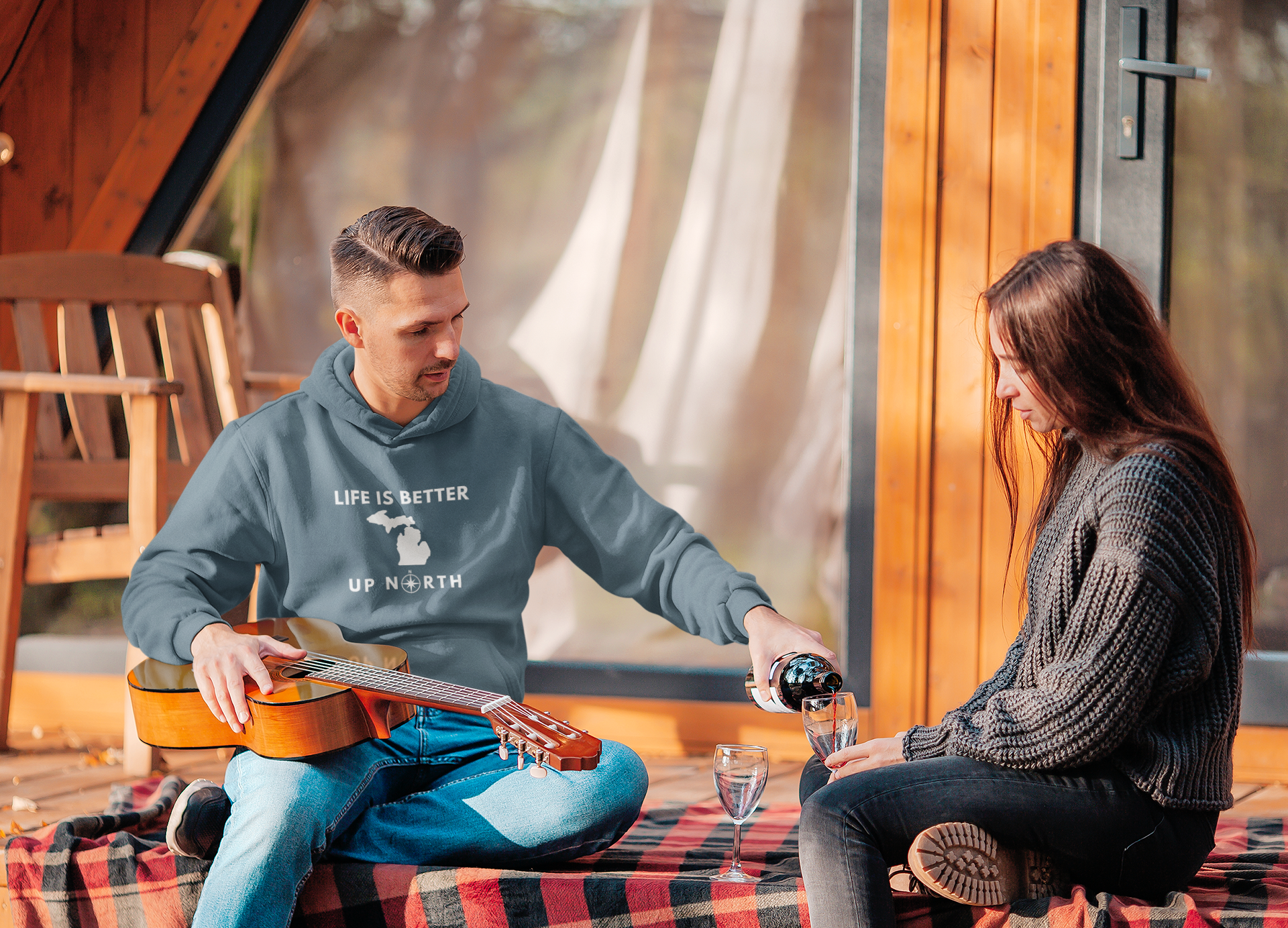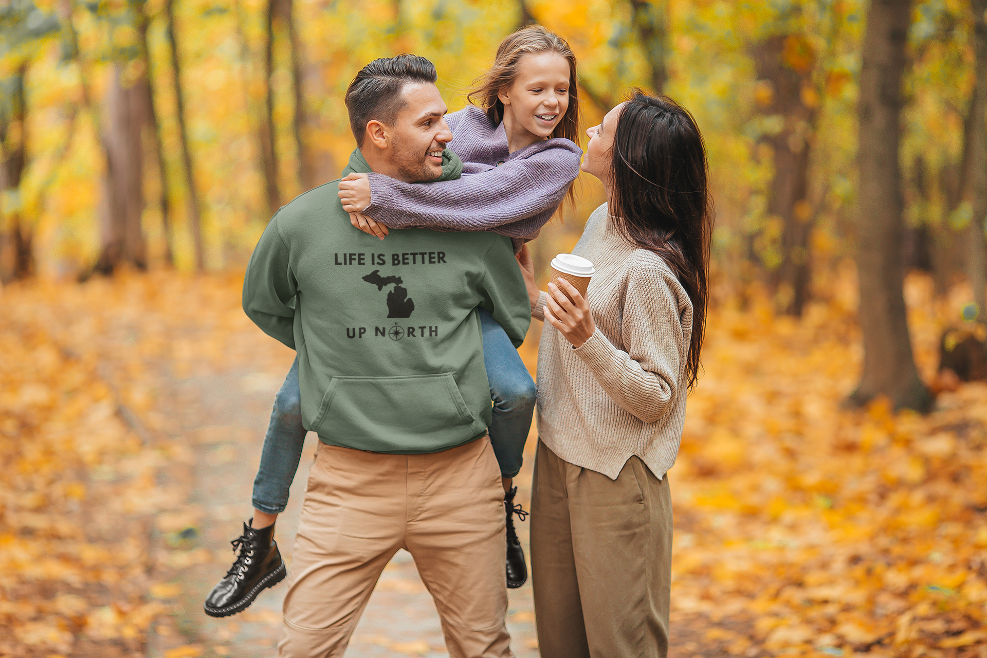 Bring the spirit of Michigan’s “Up North” to your wardrobe with our Life is Better Up North hoodie, featuring a north-facing compass design. This hoodie will be made with your choice of white or black lettering. Whether you’re spending the weekend at the cabin or just dreaming of the lakes and pines, this hoodie is perfect for keeping cozy.
