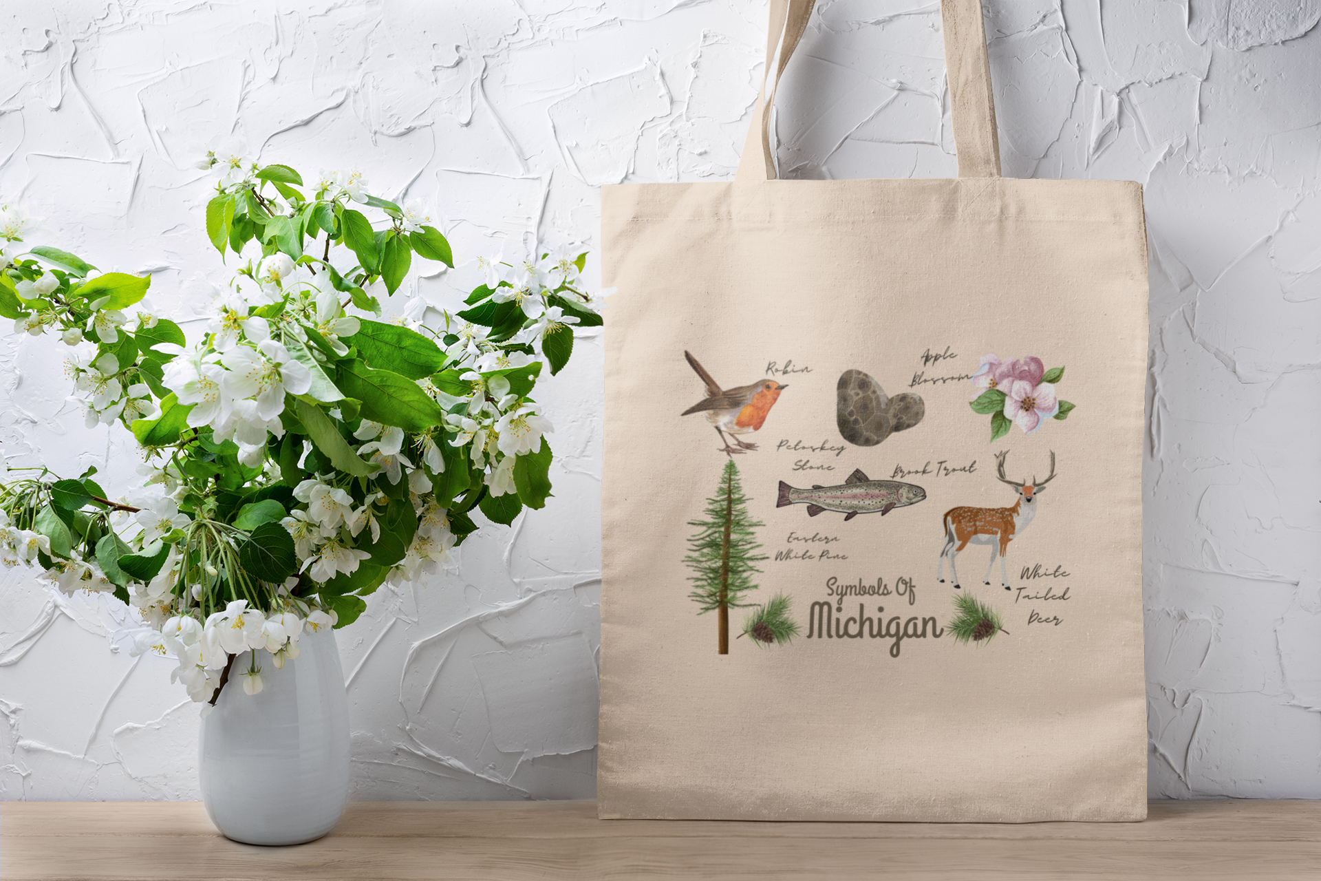 Celebrate the Great Lakes State wherever you go with this Michigan-themed 15" x 16" polyester tote. Featuring beloved state symbols—like the Petoskey stone, white-tailed deer, white pine, and robin—it’s a stylish nod to Michigan pride.