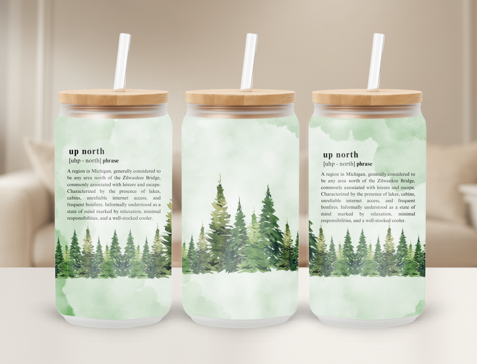 Capture the spirit of Michigan’s favorite escape with our 16oz Frosted Sipper Glass Tumbler, featuring the “Up North” Dictionary Definition: